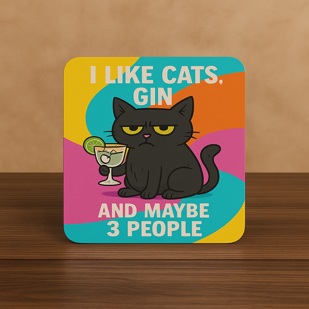 I Like Cats, Gin, and Maybe 3 People Coaster – Funny Gift for Cat Lovers